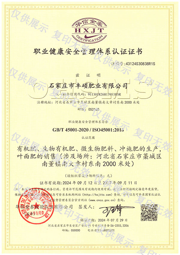 石家莊市豐碩肥業(yè)有限公司是一家集新型肥料的研發(fā)、制造、營銷、服務于一體的高新技術企業(yè),公司自2008年創(chuàng)辦以來,一直致力于新型肥料的技術研發(fā)和市場推廣。公司組建了豐碩新型肥料研究中心(院士專家企業(yè)工作站),自主知識產權研發(fā)團隊專業(yè)科研人員20余人,獲得了多項肥料國家發(fā)明專利。公司目前已擁有發(fā)酵類有機肥、微生物菌劑、生物有機肥、土壤調理劑、大量元素水溶肥、含腐植酸肥料、含氨基酸肥料、中微量元素肥料等8大品類,“金維克”、“豐碩沃農”等2大自有品牌,擁有20多個暢銷品種。目前,我公司已經通過了“ISO9001 質量管理體系認證”、“ISO14001 環(huán)境管理體系認證”、“OHSAS18001 職業(yè)健康管理體系認證”。...